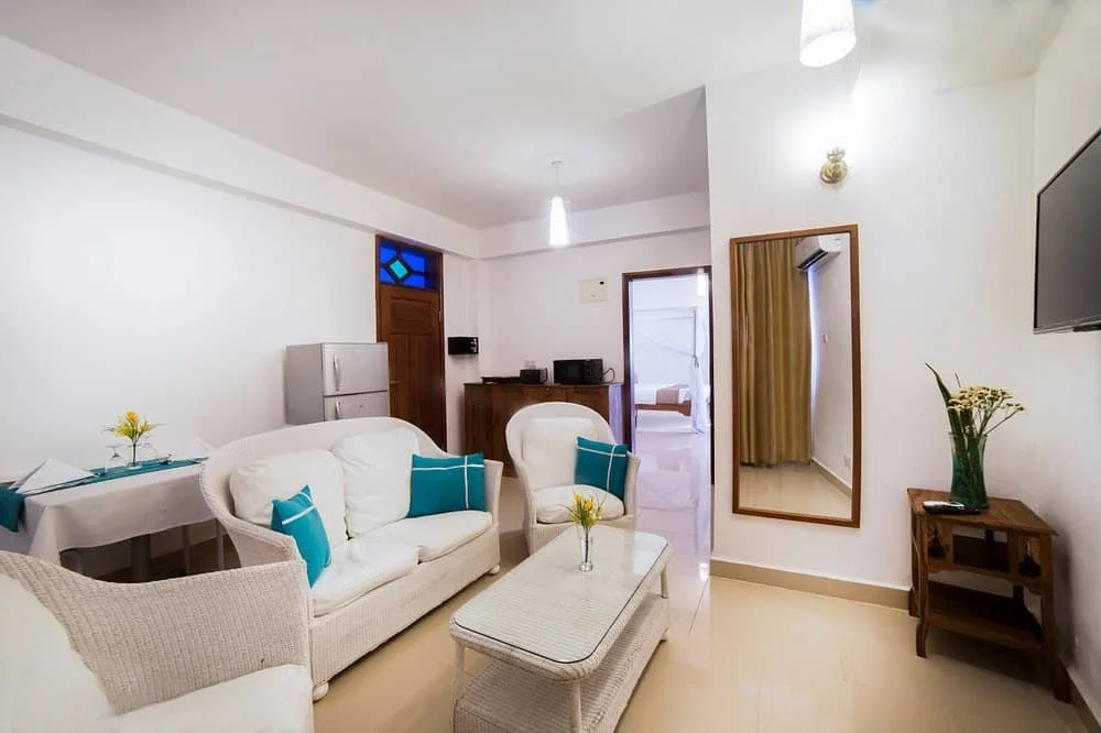 Parkplätze stehen kostenfrei zur Verfügung, ebenso wie ein Flughafentransfer gegen Aufpreis. Der internationale Flughafen Sansibar liegt etwa 8 km entfernt, der Fährhafen ist in rund 12 Minuten zu Fuß erreichbar.