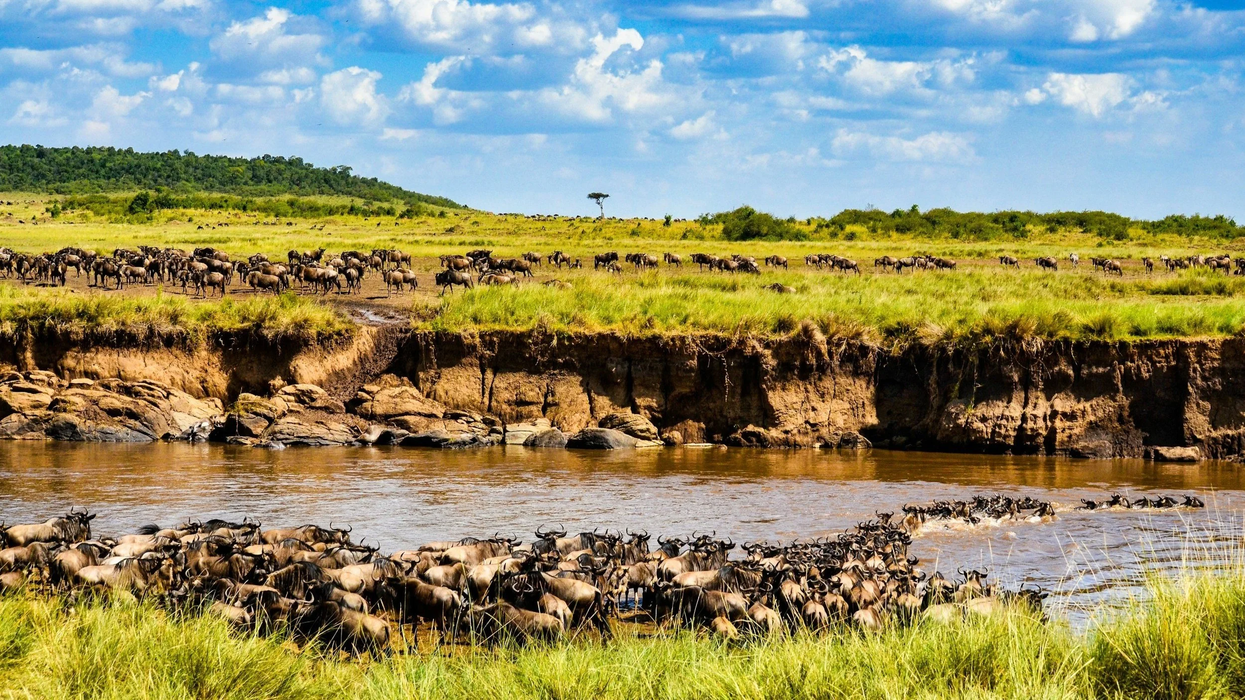 Rund 2 Millionen Gnus wandern auf ihrer Route durch die Serengeti. Im Herbst sind sie im Norden und überqueren die Flüsse. Ein atemberaubendes Schauspiel.